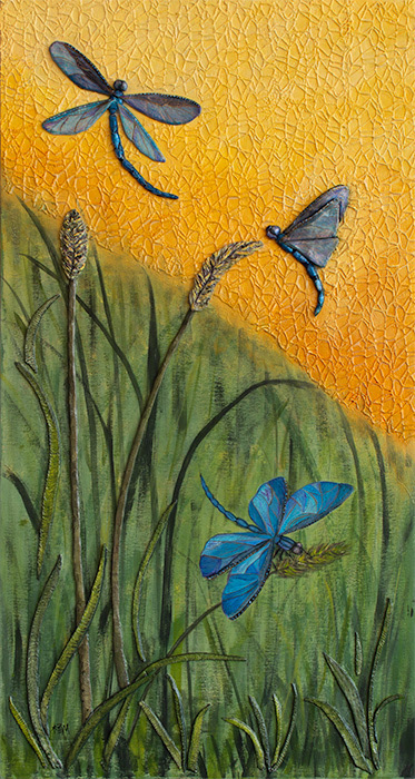 After working on the Wings of Light commision, I had to paint a dragonfly that focused on the beauty of the wings and colors of this wonderful insect. I used interference paint on the wings, so it looks different depending on the angle and light you see it in. I just love how the bright yellow-greens and blues work together on this painting.